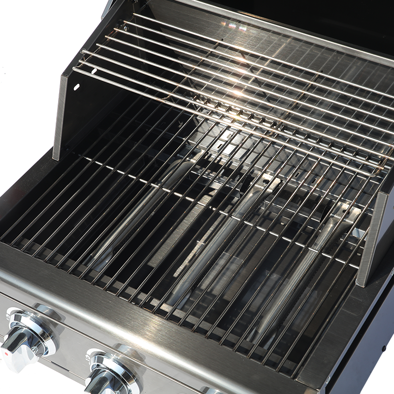 Featuring electronic pulse ignition, piezo ignition, and advanced flame and high-pressure protection, the grill is built for reliability and peace of mind in any home environment. The premium stainless steel grill grate, warming rack, and removable front grease tray ensure convenience and easy maintenance.